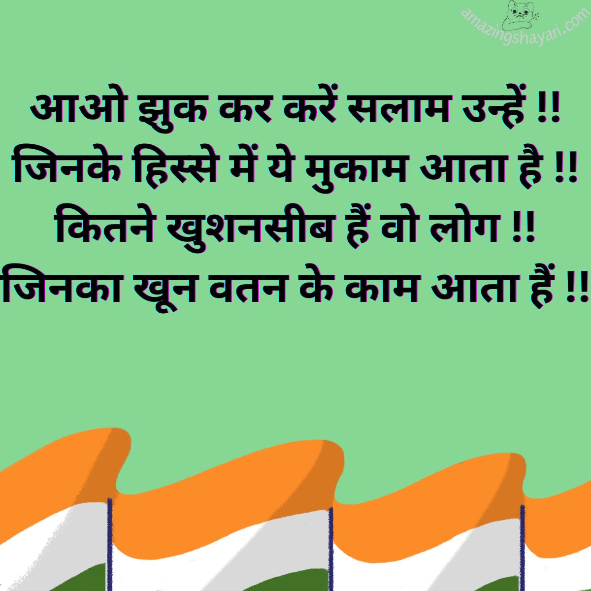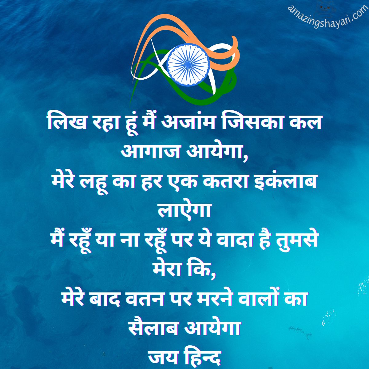 नमस्कार दोस्तों हम आप लोगों के लिए जबरदस्त Desh Bhakti Shayari in Hindi लाये हैं। अगर आप देश भक्ति के लिए सर्वश्रेष्ठ शायरी ढूंढ रहे हैं, तो आप सही जगह पर हैं, क्योंकि हम देश भक्ति पर नवीनतम शायरी का बड़ा संग्रह प्रदान कर रहे हैं। मुझे आशा है कि आपको ये संग्रह पसंद आया होगा। पढ़ें और अपने मित्र के साथ साझा करें