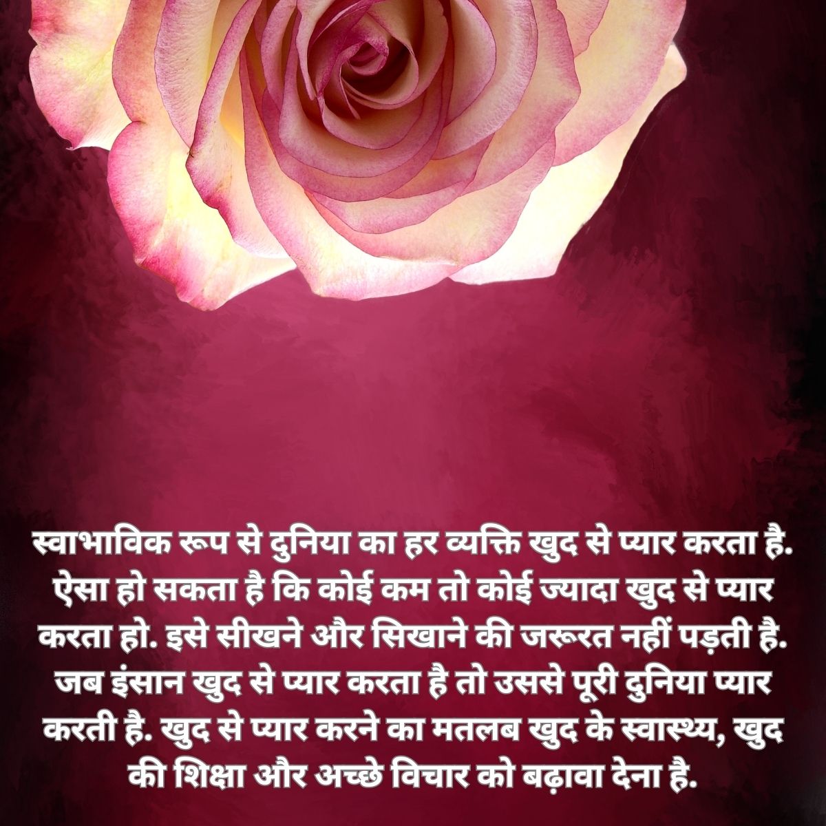 स्वाभाविक रूप से दुनिया का हर व्यक्ति खुद से प्यार करता है. ऐसा हो सकता है कि कोई कम तो कोई ज्यादा खुद से प्यार करता हो. इसे सीखने और सिखाने की जरूरत नहीं पड़ती है. जब इंसान खुद से प्यार करता है तो उससे पूरी दुनिया प्यार करती है. खुद से प्यार करने का मतलब खुद के स्वास्थ्य, खुद की शिक्षा और अच्छे विचार को बढ़ावा देना है.